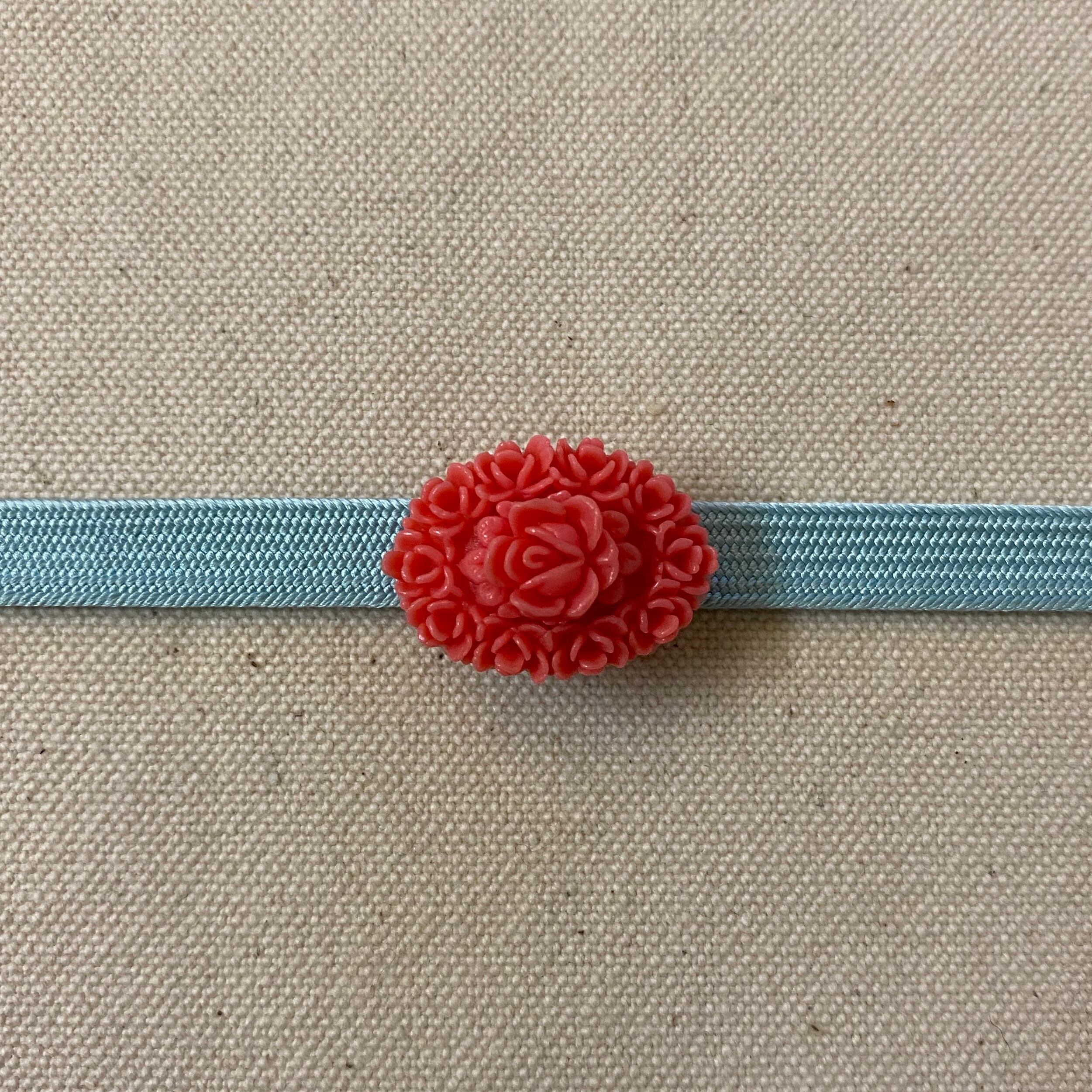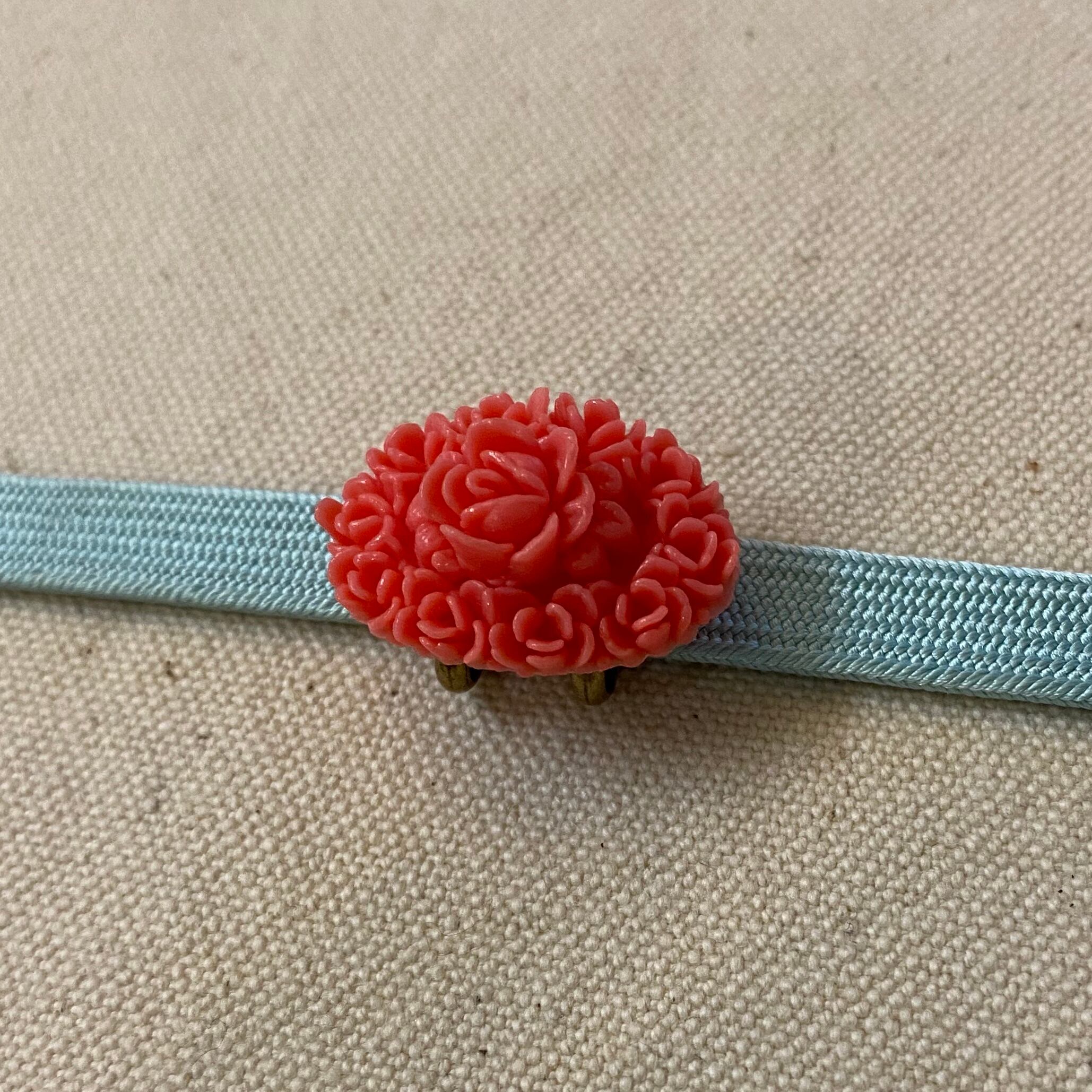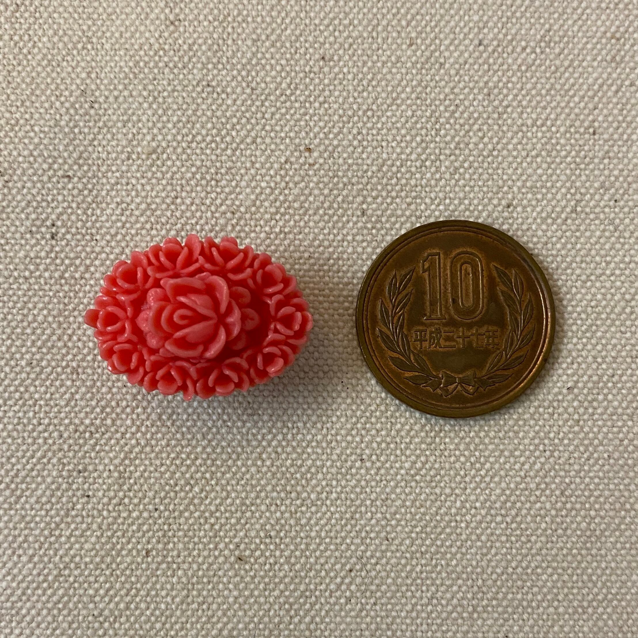 名古屋帯や半幅帯に。小さくてかわいらしい薔薇のレリーフを使用しています。日本の古き良き時代を感じる珊瑚色(コーラル)のセルロイド製。昭和初期頃のものではないかと思われます。アンティークや正統派のお着物姿に。浴衣に半幅博多帯などのコーディネートにもオススメです。