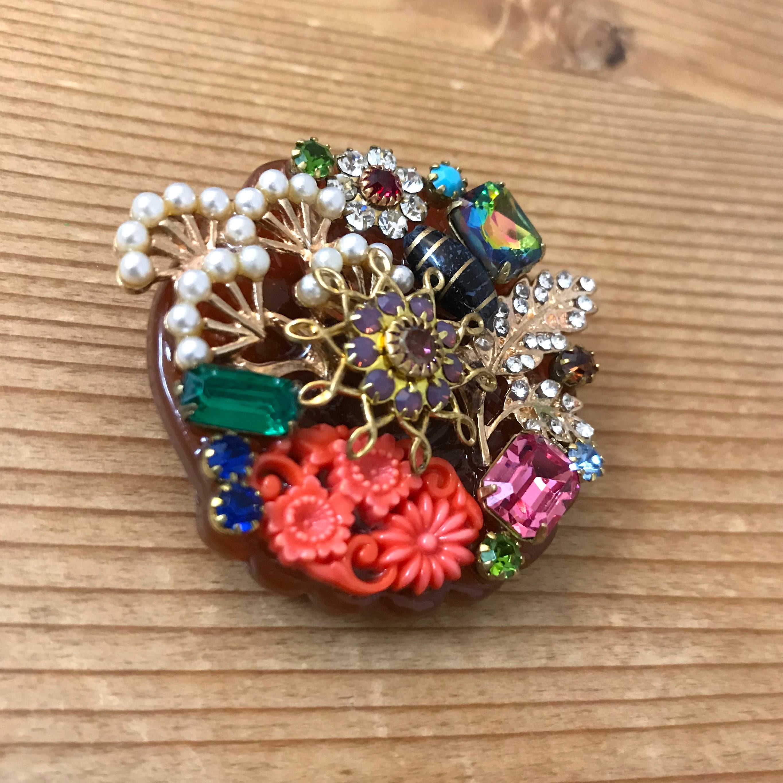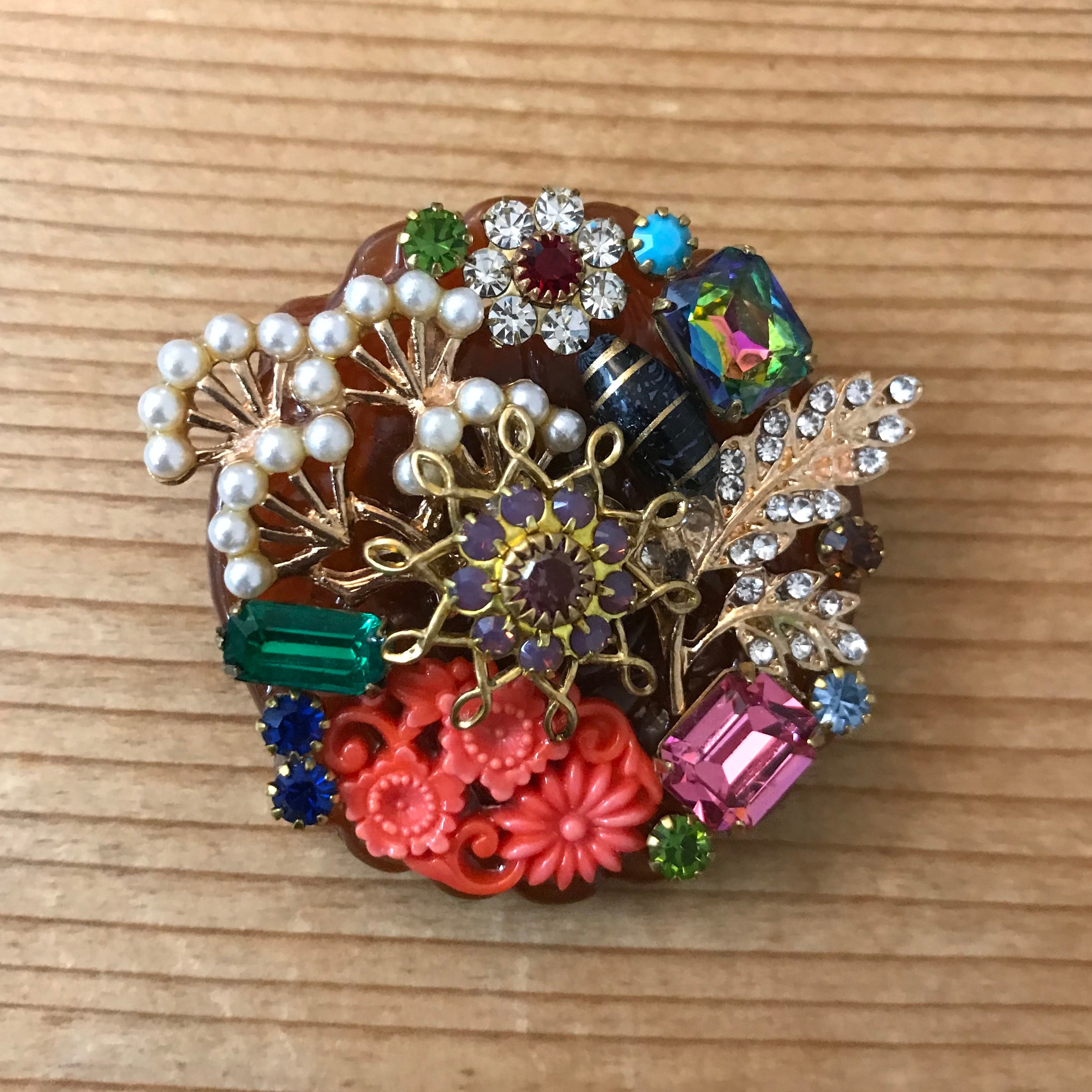 今回はメイドイン香港の鳥モチーフの土台に、ヴィンテージスワロフスキーや、インポートパーツ、希少な美しいジャパンヴィンテージのガラスカボションなどをギュッと詰め込み、配置しています。